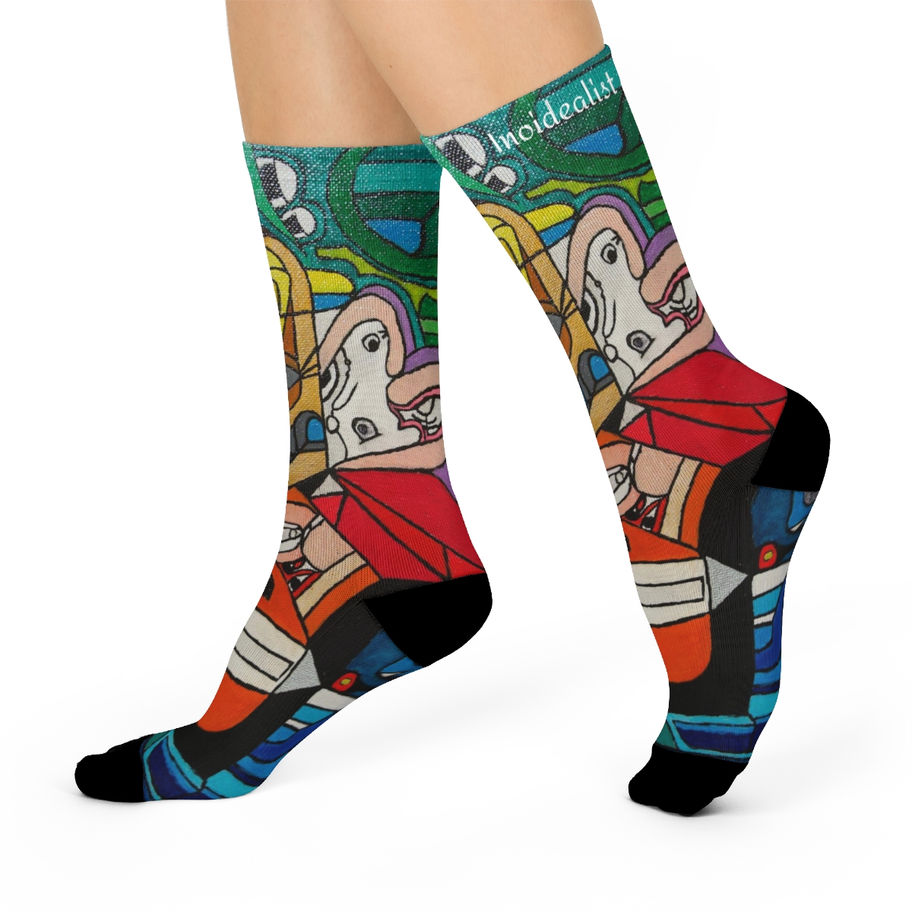 Cushioned crew socks are a one-sizstyle upll solution up to a men’s size 12. The base color is white with black on the toes and heel. The construction is 73% polyester, 18% nylon, 6% spandex, and 3% cotton. Add some foundational character with an all-over-print design; giving your customers a chance to style-up their footwear. .: Material: 73% polyester, 18% nylon, 3% cotton, 6% spandex .: One size: comfortably fits women's size 5 US up to men's size 12 US .: 200 needle knit premium socks .: Cushioned bottoms
